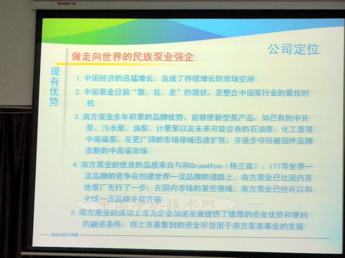 (水业中国网上海工作站12月13日讯)南方泵业2013媒体见面会今天上午在位于浙江省杭州市余杭区南方泵业股份有限公司五楼会议室召开。南方泵业的高层对公司规模及战略发展以及全系列产品作了讲解,并对新成立的合资企业-鹤见南方的系列产品作了详细讲解,并提到杭州地铁2号线就购买了本公司上千万人民币的潜水污水泵,明年南方泵业也将该板块业务作为新的增长点,重点进军中国污水处理领域;今天下午将邀请媒体代表专门前往鹤见南方公司现场参观。