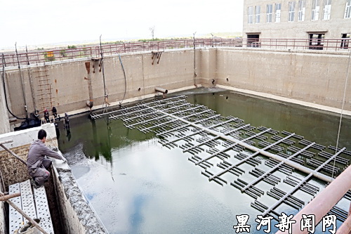 图为:工人在黑龙江省黑河市孙吴县城市排水及污水治理工程项目反应池施工。